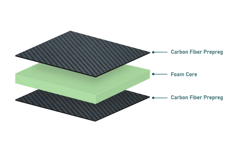 Los paneles sándwich de fibra de carbono presentan características populares: usan una piel de fibra de carbono 3K 2×2 con tejido sarga y ofrecen varias opciones de tratamiento superficial. Esto asegura una superficie lisa sin bordes ásperos. Los materiales del núcleo incluyen núcleo de espuma, madera contrachapada y panal de PP. Los núcleos de espuma están disponibles en espuma XPS, PET, PVC y PU. Podemos personalizar el material del núcleo según sus requisitos, seleccionando diferentes densidades y propiedades de conductividad térmica para rellenar. Empleamos laminación al vacío de alta presión para prevenir la delaminación con el tiempo, asegurando un fuerte rendimiento de unión.